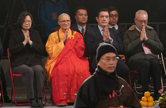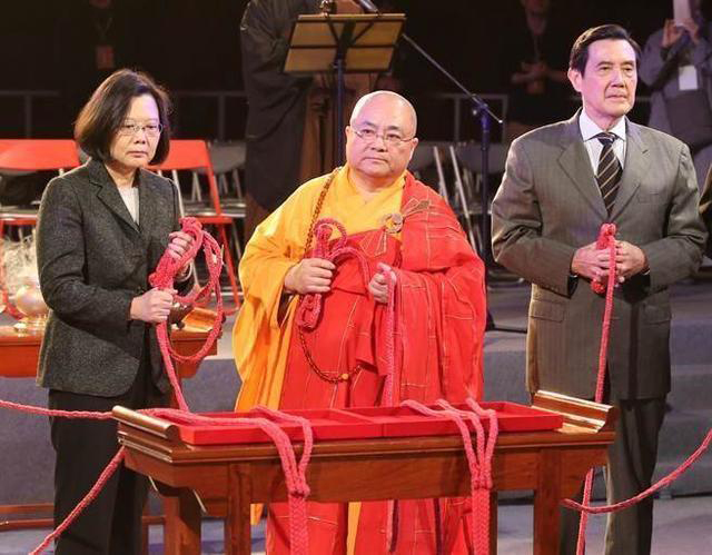 法鼓山除夕敲鐘,蔡英文、馬英九、吳敦義同框祈福無交集。(圖片來源:臺灣“東森新聞云”)