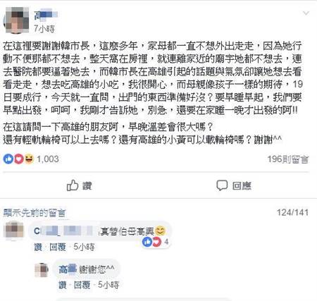 然而,近日來,韓國瑜在高雄引起的話題與氣氛卻讓她媽媽想去看看走走,想去吃高雄的小吃,“母親像孩子一樣的期待,19日要成行,今天就一直問,出門的東西準備好沒?要早睡早起,我們要早點出發”。該網友也向高雄網友問及,早晚溫差會不會很大、輕軌輪椅可否上去、高雄的小黃能不能載輪椅等問題。