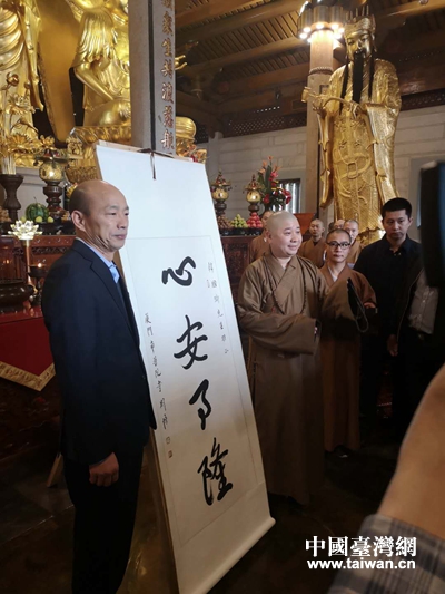 高雄市長韓國瑜27日一早赴廈門南普陀寺參拜,大陸佛教協會副會長則悟法師特贈一幅“心安事隆”墨寶。(中國臺灣網版權圖片)