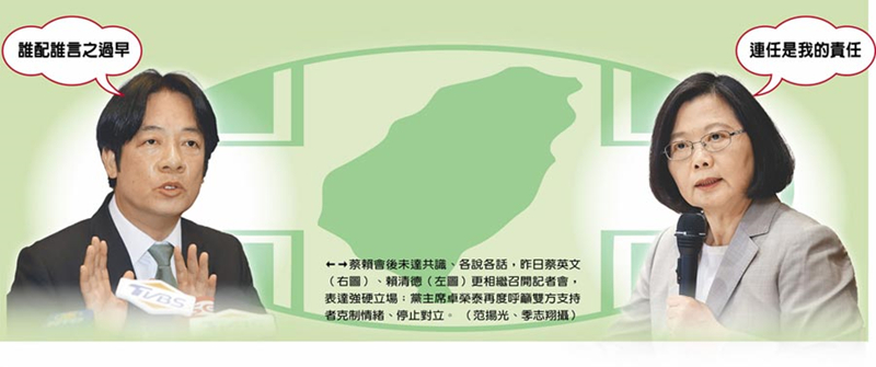 蔡賴會后未達共識、各說各話,昨日蔡英文(右圖)、賴清德(左圖)更相繼召開記者會,表達強硬立場。(圖片來源:臺灣“中時電子報”)