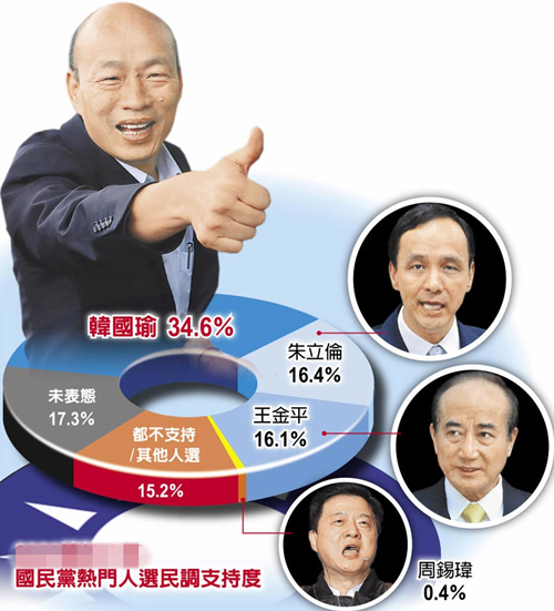 國民黨最新民調(diào)顯示,韓國瑜支持度勝過朱立倫王金平總和。(圖片來源:臺灣“中時電子報”)