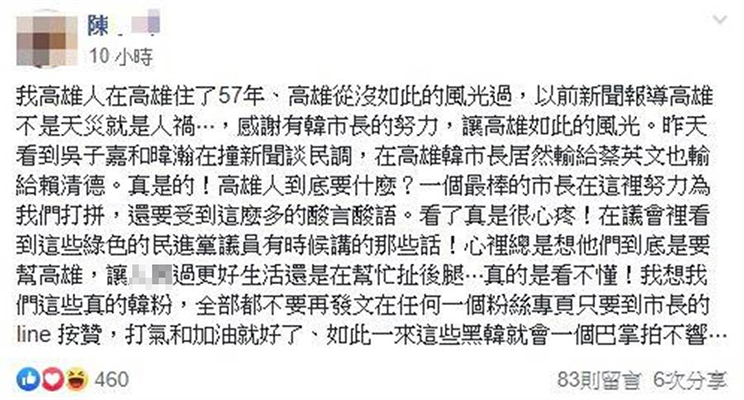 中國臺灣網(wǎng)5月7日訊 據(jù)臺灣“中時電子報”報道,臺灣“美麗島電子報”董事長吳子嘉昨日(6日)在廣播節(jié)目中提及最新民調(diào),并稱高雄市長韓國瑜若參選2020,無論對上賴清德或蔡英文,在高雄市皆輸3%至4%。對此,有名網(wǎng)友表示,她在高雄住了57年,“高雄從沒如此的風(fēng)光過!”并表示看到韓國瑜打拼還要受到這么多的酸言酸語,很心疼!
