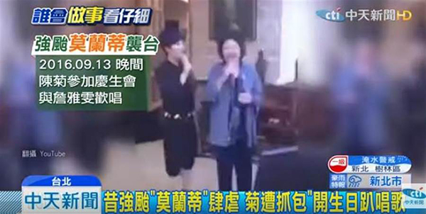 高雄前市長(zhǎng)陳菊,2016年的強(qiáng)臺(tái)風(fēng)“莫蘭蒂”過(guò)境時(shí)高雄災(zāi)情嚴(yán)重,她晚上卻參加朋友慶生會(huì),還和臺(tái)灣歌手詹雅雯開心唱歌。(圖片取自臺(tái)媒)