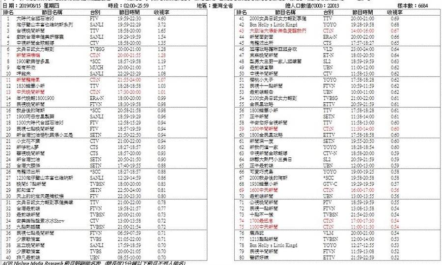 日前,有“韓黑”網友在臉譜網(facebook)痛批《新聞深喉嚨》,稱其內容偏頗、立場偏狹、言談不實,還質疑收視率必定很慘,唱衰一定播不下去、很快收攤,還對節目來賓極盡威脅、辱罵!缎侣勆詈韲怠纺樧V網立刻發文,貼出8月15日收視率排行表,清晰可見《新聞深喉嚨》不僅全臺收視排行第7,更高居全臺同類型節目收視第1!