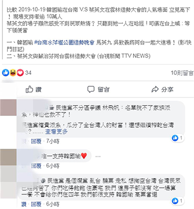 中國臺灣網(wǎng)10月21日訊 據(jù)臺灣“中時電子報”報道,韓國瑜和蔡英文19日都不約而同在臺灣南部舉辦造勢大會,但網(wǎng)友比較兩人造勢的人氣,蔡英文的場子只聽見她一人在念經(jīng)!司儀在臺上喊:等下領(lǐng)便當(dāng)!但韓國瑜的場子則是充滿歡樂的氣息,高下之別,馬上判斷出來。