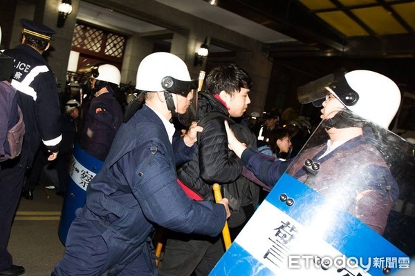 “太陽花學(xué)運”期間占領(lǐng)“行政院”運動爆發(fā)警民沖突。(圖片來源:臺灣“東森新聞云”)