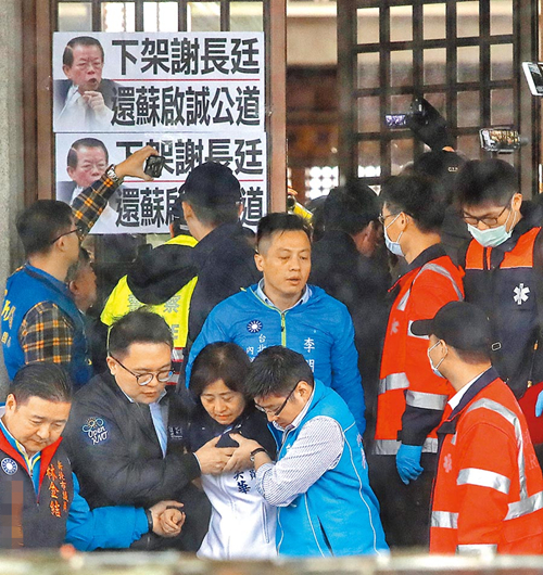 多位國民黨“立委”與市議員6日赴臺當局“外交部”抗議,警衛關起大門阻擋進入,推擠之下“藍委”林奕華(下中)受傷,被護送送醫。(圖片來源:臺灣《中國時報》)