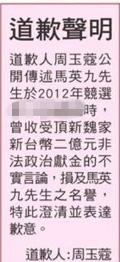 周玉蔻的道歉啟事內容如下:道歉聲明,道歉人周玉蔻公開傳述馬英九先生于2012年競選臺灣地區領導人時,曾收受頂新魏家新臺幣二億元非法政治獻金的不實言論,損及馬英九先生之名譽,特此澄清并表達歉意。道歉人:周玉蔻。(中國臺灣網 賈若瀾)
