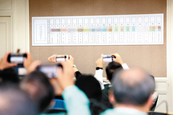 選務(wù)人員今天上午在臺東縣政府大禮堂清點選票,蘇基山表示,政黨票長達76.5厘米,讓選務(wù)人員抱得相當吃力。4年前選票上有18個政黨,政黨選票73厘米,今年19個政黨,選票76.5厘米再創(chuàng)紀錄。(中國臺灣網(wǎng) 李寧)