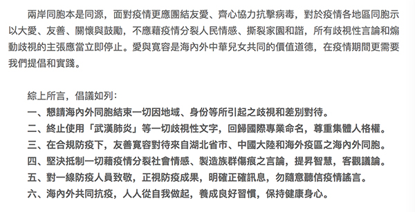 倡議書(shū)提到,自2020年初伊始,新冠肺炎疫情在兩岸及國(guó)際上蔓延開(kāi)來(lái),世界衛(wèi)生組織(WHO)已將此次疫情定為國(guó)際緊急公衛(wèi)事件,呼吁全球攜手合作共抗疫情,同時(shí)也將此病毒正式定名為“COVID-19”,中文名為“新型冠狀病毒肺炎”,簡(jiǎn)稱為“新冠肺炎”。部分媒體和公眾人士至今仍以帶有歧視性意涵的字眼將該病毒簡(jiǎn)稱為“武漢肺炎”,甚至將滯留湖北而計(jì)劃返回臺(tái)灣者冠上“木馬屠城”和“生化武器”的標(biāo)簽,并且以各種言語(yǔ)行動(dòng)歧視來(lái)自中國(guó)大陸的人士,包括陸籍配偶及其子女、臺(tái)商、在陸工作就學(xué)臺(tái)青、在臺(tái)就讀陸生等,令人感到十分遺憾。