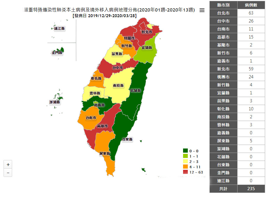 目前,臺灣地區已累計235例確診病例,仍以臺北市最多有63例,新北市59例、臺中市26例、桃園市24例、高雄市15例、臺南市11例、彰化縣10例等,原本0確診的嘉義市也“破蛋”,新增一例,目前僅剩嘉義縣、花蓮縣、臺東縣、澎湖縣、金門縣和連江縣,共6縣市維持0確診。(中國臺灣網 全志強)