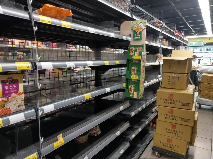 不過,有臺灣網友昨天到附近賣場,發現架上所有東西都被搶購一空。通過網友發布的照片顯示,貨架上的東西已經一掃而空,只剩下標價,連米都所剩無幾,讓網友大嘆。
