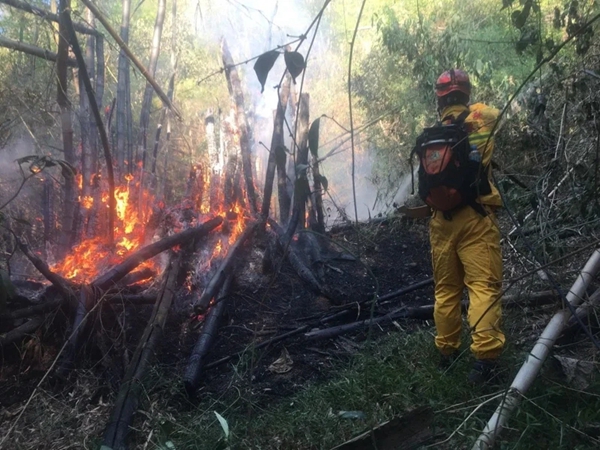 高雄市六龜新威山區(qū)昨起發(fā)生林地山火,竹林燃燒后火勢猛烈。(圖片取自臺媒)