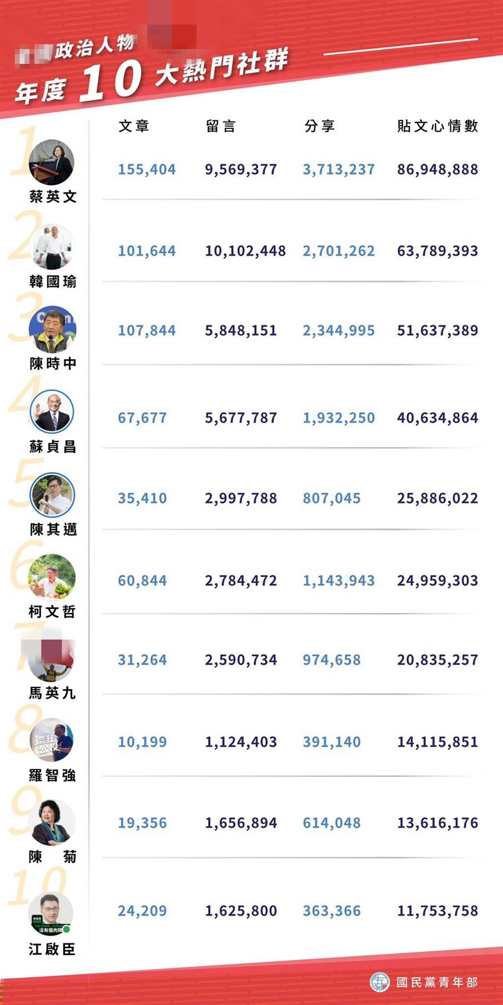國(guó)民黨青年部主任陳冠安說(shuō),臉譜網(wǎng)是臺(tái)灣最主要的政治攻防網(wǎng)絡(luò)戰(zhàn)場(chǎng),他以文章、留言、分享、貼文心情數(shù)做大數(shù)據(jù)分析,全臺(tái)12強(qiáng)依次是蔡英文、韓國(guó)瑜、陳時(shí)中、蘇貞昌、陳其邁、柯文哲、馬英九、羅智強(qiáng)、陳菊、江啟臣、侯友宜及賴(lài)清德。