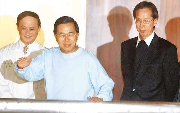 圖為2005年陳水扁(中)在黃芳彥(右)陪同下赴臺大健檢。(圖片來源:臺灣“中時新聞網”)