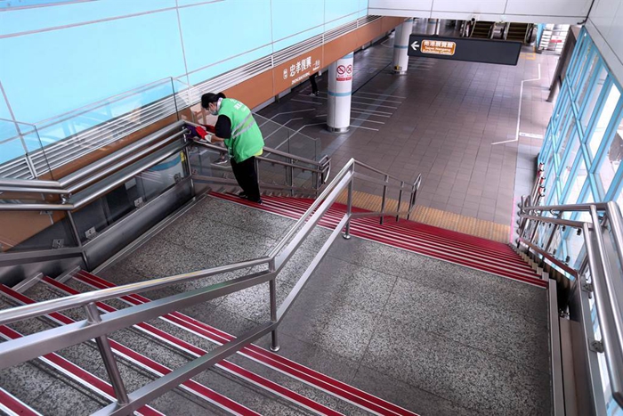 16日下午2時(shí)的臺(tái)北地鐵文湖線忠孝復(fù)興站僅零星民眾搭乘,清潔人員正在消毒樓梯扶手。(圖片來(lái)源:臺(tái)灣“中時(shí)新聞網(wǎng)”)