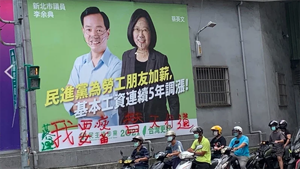 蔡英文和新北市議員李余典的肖像廣告牌被人涂鴉破壞。(圖片取自臺媒)
