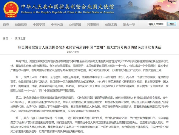 中國(guó)臺(tái)灣網(wǎng)10月23日訊 中國(guó)駐美國(guó)使館發(fā)言人23日就美國(guó)務(wù)院東亞局官員所謂中國(guó)“濫用”聯(lián)大2758號(hào)決議的錯(cuò)誤言論發(fā)表談話。發(fā)言人表示,10月21日,美國(guó)國(guó)務(wù)院東亞局官員在參加德國(guó)馬歇爾基金會(huì)研討會(huì)時(shí)無(wú)理指責(zé)中國(guó)“濫用”聯(lián)大2758號(hào)決議將臺(tái)灣排除在聯(lián)合國(guó)活動(dòng)之外,鼓吹推動(dòng)臺(tái)參與聯(lián)合國(guó)活動(dòng)。有關(guān)言論罔顧事實(shí)、混淆視聽(tīng),本質(zhì)就是要在國(guó)際上制造“一中一臺(tái)”,公然挑戰(zhàn)一個(gè)中國(guó)原則,是對(duì)中方嚴(yán)重的政治挑釁,也是對(duì)國(guó)際法和公認(rèn)的國(guó)際關(guān)系準(zhǔn)則的惡意歪曲。中方對(duì)此堅(jiān)決反對(duì),已經(jīng)向美方提出嚴(yán)正交涉。