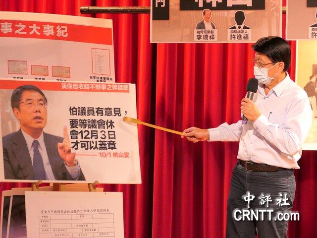 中國(guó)臺(tái)灣網(wǎng)7月8日訊 據(jù)港媒報(bào)道,中國(guó)國(guó)民黨臺(tái)南市長(zhǎng)參選人謝龍介昨(7日)赴臺(tái)北開記者會(huì),指控民進(jìn)黨臺(tái)南市長(zhǎng)黃偉哲涉貪向靈骨塔業(yè)者索賄新臺(tái)幣1千萬(wàn),業(yè)者李瑞祥也現(xiàn)身說(shuō)法。謝龍介端出桌椅還原黃偉哲與業(yè)者餐宴現(xiàn)場(chǎng),并拿著抓癢用的“不求人”指著大字報(bào)說(shuō)明細(xì)節(jié),引得臺(tái)下媒體不時(shí)傳出笑聲。