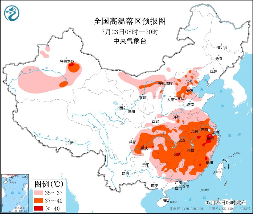 全國高溫落區預報圖(7月23日08時-20時)