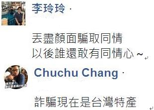 發文的這名網友表示“真的很丟臺灣人的臉!”,呼吁其他去大陸旅游的民眾要多注意,千萬別再受騙上當。也有許多臺灣人表示“詐騙現在是臺灣特產”“丟盡顏面騙取同情,以后誰還敢有同情心”。