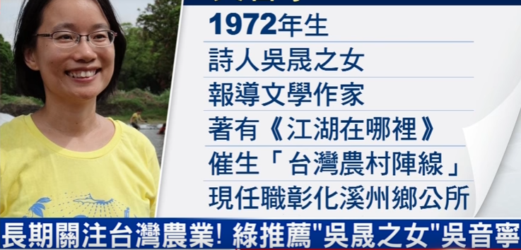 臺媒報道,吳音寧過去曾遁入墨西哥叢林生活,也曾寫書探討臺灣農(nóng)業(yè)問題,當(dāng)時以為寫作會是她人生的志業(yè)。沒想到的是,表哥黃盛祿選上彰化溪州鄉(xiāng)長,缺個幫手;吳音寧不顧父親吳晟的反對,決心幫忙,成了鄉(xiāng)公所主任秘書。