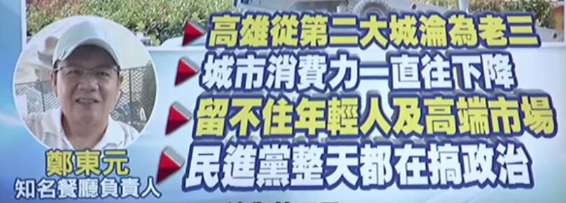 此外,在受訪時(shí)鄭東元還指出了高雄如今面臨的幾大問題:從過去全臺第二大城淪為老三,城市整體消費(fèi)力持續(xù)下滑,留不住年輕人及高端市場……他直言,如今高雄的經(jīng)濟(jì)出現(xiàn)了嚴(yán)重問題,而民進(jìn)黨卻整天忙著搞政治,根本不關(guān)注基層百姓的經(jīng)濟(jì)民生及招商引資,痛批“民進(jìn)黨只會拼政治,不會拼經(jīng)濟(jì)”!