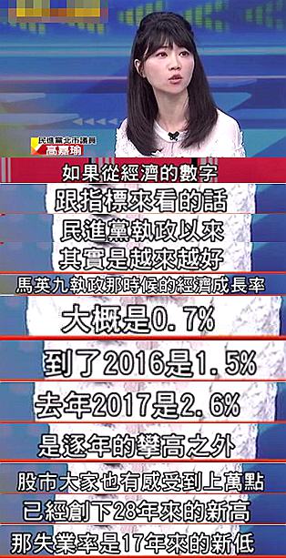 來看看這位民進(jìn)黨議員是如何為“鐵票倉跳票”作解釋的吧:民進(jìn)黨曾批判馬英九是“數(shù)字治臺”,而這個綠營小姐姐一上來就先祭出“數(shù)字陣”,說從經(jīng)濟(jì)指數(shù)上看,民進(jìn)黨與馬英九執(zhí)政時(shí)期好很多了啊;之后拿出“甩鍋招”,說飯店倒閉有很多方面的原因啊,店家不要都怪到民進(jìn)黨身上,你們自己也要轉(zhuǎn)型啊;接著開始“數(shù)政績”,說陸客雖然不來了,但日本和東南亞客人有增加啊,而且像臺中市長林佳龍之類的也有積極的幫地方在招商啊;最后搬出“誠懇臉”,表示雖然民進(jìn)黨做了很多“復(fù)興經(jīng)濟(jì)”的事,但若人民感受不到,那蔡當(dāng)局也會“好好檢討”……