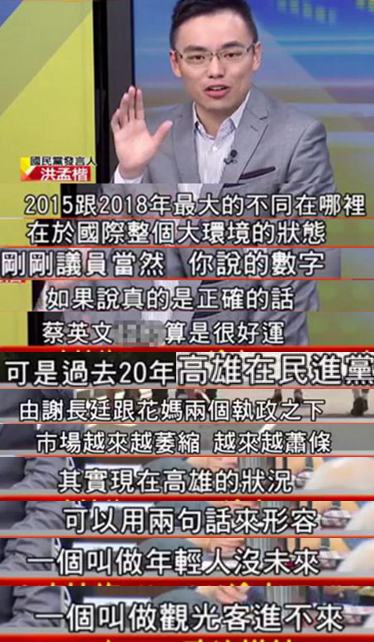 國民黨發(fā)言人洪孟楷先發(fā)制人的表示,如果議員給出的數(shù)字是正確的話,那只能說“蔡英文算是很好運(yùn)”,而事實(shí)是,高雄在民進(jìn)黨近20年的執(zhí)政下,現(xiàn)況用兩句話就能形容:1)年輕人沒未來;2)觀光客進(jìn)不來。