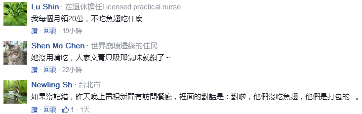 她表示,5月9日吳音寧還在臉譜網(wǎng)大談,北農(nóng)的基層有多么辛苦,所以為北農(nóng)加薪!5月11日,她就在高雄吃魚翅。蔡英文吃法國(guó)料理挨轟、李應(yīng)元吃魚翅道歉,比起他們的小老妹日子爽爽過(guò),其實(shí)還真冤枉了。