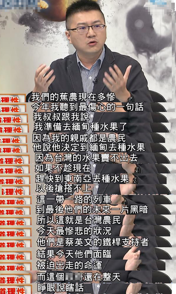 那么,究竟臺灣民眾現(xiàn)在到底有多慘?近期,懵妹在一檔政論節(jié)目中看到臺灣嘉賓是這樣說的:“因?yàn)榕_灣的水果賣不出去,我叔叔要到緬甸種水果,以后搶搭不上‘一帶一路’的列車,到最后未來一片黑暗”。