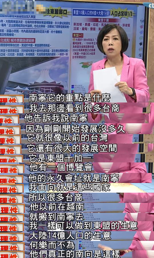 在節(jié)目中,一位去過廣西見到邊境貿(mào)易的嘉賓說道:“就只隔一條河,雙邊的貿(mào)易往來卻很繁榮”,他還說:“當(dāng)臺灣還在搞政治斗爭的時候,他們(大陸)是花了很多精力真的是要發(fā)展經(jīng)濟(jì)的”。