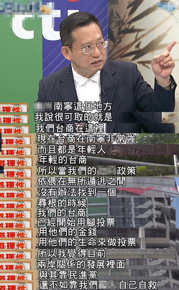 臺灣的人才面臨這樣的窘境,逼不得已離開臺灣,到大陸尋找新的生機(jī)。正如下面這位嘉賓所言,“當(dāng)我們的政策依偎在無所遁逃之間,沒有辦法找到尋根的時候,我們的臺商已經(jīng)開始用腳投票,兩岸關(guān)系發(fā)展里面,與其靠民進(jìn)黨,不如靠我們自己自救。”
