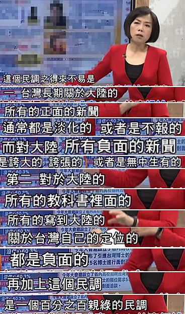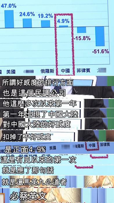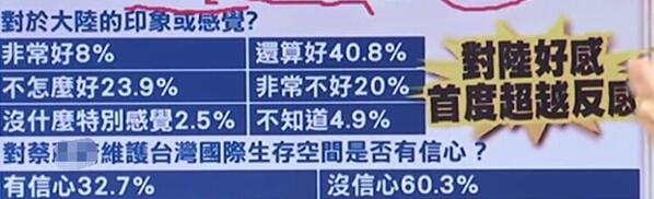 同一份親綠媒體的數據顯示,臺灣民眾對大陸的好感度“有史以來第一次”出現了正面評價,政論節目主持人黃智賢對此表示,這個100%親綠民調能有這樣的結果絕對是“來之不易”,黃暐瀚更激動地直言,這份好感度的排名也印證了那句話——還馬英九公道者必蔡英文!