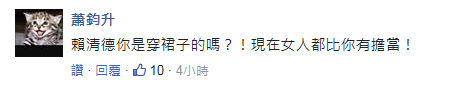 不料此話一出,即遭網(wǎng)友打臉,“天天鞭尸馬英九,那選你們上臺干嘛,找借口誰都會,下次選頭豬好了!”還有人對賴清德的性別持懷疑態(tài)度,“‘賴院長’難道穿的是裙子?話說現(xiàn)在的女人都比你有擔(dān)當(dāng)……”“喜歡打太極?那年底就讓你們下臺!”