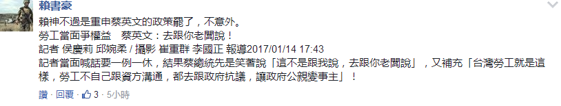 國(guó)民黨基隆市長(zhǎng)參選人謝立功說(shuō),這番言論和蔡英文“向老板拍桌”論有異曲同工之妙,除了“干話”成分高,一樣不接地氣、不知民間疾苦。