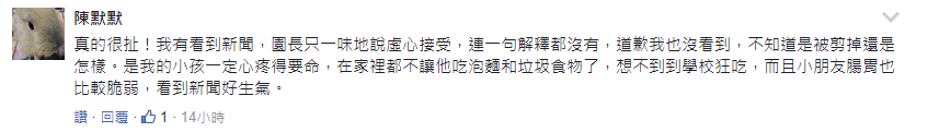 原Po認(rèn)為“因信任學(xué)校,從未懷疑過(guò)餐點(diǎn)狀況,現(xiàn)在才發(fā)現(xiàn)原來(lái)是……”,他也指出“給孩子的餐點(diǎn)至少要新鮮均衡,不是說(shuō)要大魚大肉,但既然身為教育業(yè),請(qǐng)至少有點(diǎn)良心,希望園方的初衷是為了學(xué)生好,而不是自己的口袋飽。”