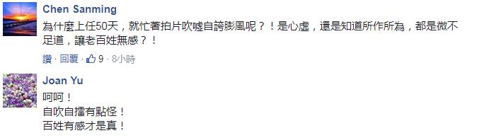 也有網友認為,蘇貞昌根本就是“心虛”或者他很清楚自己所做的事都讓老百姓無感,而只有“無能的人才會細說自己做了什么”,因為“會做事的人不用自己細說,人民都在看”;還有人拿如今風頭正勁的韓國瑜類比,直言“韓國瑜有拿影片抬高自己嗎?沒有!但民眾心中有一桿稱”。