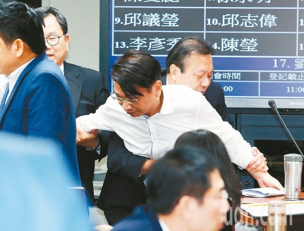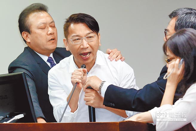 徐永明(中)占據(jù)質(zhì)詢臺要求復(fù)議期過后才初審,持續(xù)僵持不下,民進(jìn)黨“立委”蘇震清(左)與陳明文(右)上臺軟性規(guī)勸,依舊無法順利開會,晚間蘇、陳兩人合力把徐永明架出議場外。(圖片來源:《中時電子報》)