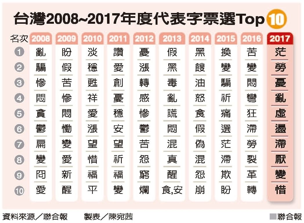 臺灣2008~2017年度代表字票選Top10。(圖片來源:臺灣《聯(lián)合報》)