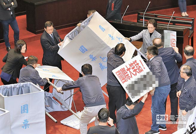 投票前,國民黨“立委”抗議并將圈票處推倒。(圖片來源:臺灣《中時電子報》)
