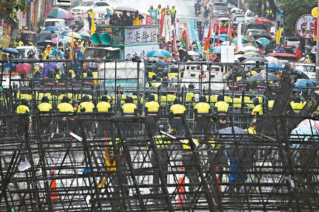 勞工與學(xué)生團(tuán)體23日舉行反“勞基法”修惡大游行,在“行政院”前靜坐的游行群眾,晚間再度與警方爆發(fā)肢體沖突。(圖片來(lái)源:臺(tái)灣《中時(shí)電子報(bào)》)