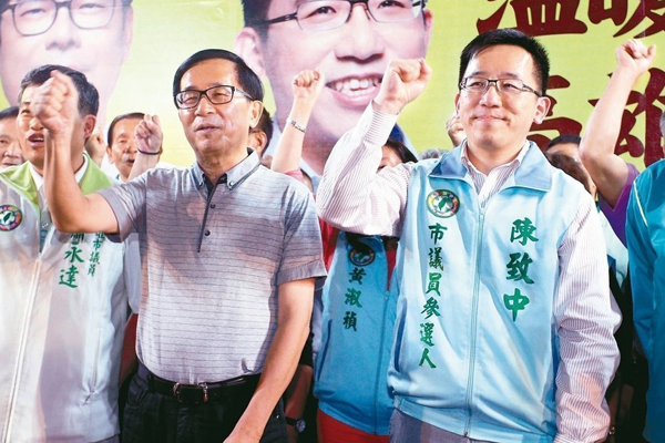 陳水扁參加兒子陳致中的選舉造勢晚會。(圖片來源:臺灣《聯(lián)合報》)