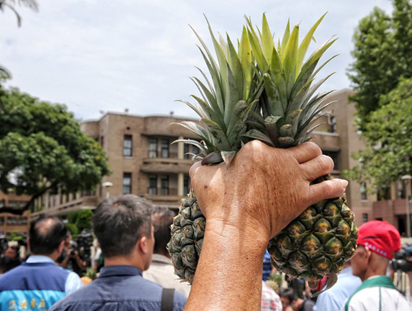 有農民高舉鳳梨抗議,控訴臺當局產銷管控不彰。(圖片來源:臺灣《聯合報》)