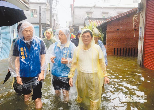 韓國瑜(左)到永安區(qū)永華路探視淹水災(zāi)情。(圖片來源:臺灣“中時電子報”)