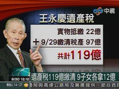 王永慶2008年10月突然過世,據(jù)指出,王永慶在島內(nèi)共留下595億元的遺產(chǎn),共需繳交119億元的遺產(chǎn)稅,其中,在去年9月有113億元入帳,使得9月份的遺產(chǎn)稅實征凈額達133億元,創(chuàng)下的史上單月新高紀(jì)錄。另外6億元的實物抵繳部分,也在11月由臺當(dāng)局“財政部國有財產(chǎn)局”完成土地變更為公有。119億元的遺產(chǎn)稅悉數(shù)上繳,如果再加上28億元的贈與稅,合計王家去年共繳交了147億元的遺贈稅。(中國臺灣網(wǎng) 馮江)