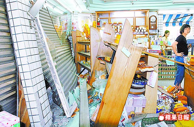 將食品店內(nèi)石柱撞斷,物品散落滿地。圖片來源:臺(tái)灣《蘋果日?qǐng)?bào)》