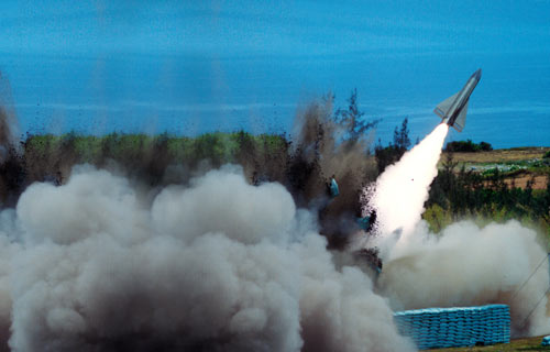 據臺灣《中時電子報》報道,臺軍于本周在屏東九鵬基地舉行大規模聯合防空飛彈實彈操演,臺灣防空主力天弓一、二型及鷹式導彈,都將上場實測,美軍評估小組也全程參與觀察。第一階段試射過程中,有海軍陸戰隊發射的刺針導彈脫靶,初步研判是靶機熱源不足。