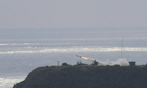 屏東九鵬基地18日舉行“聯(lián)合防空火力實(shí)彈射擊測(cè)考”,前后共發(fā)射2枚車載劍一導(dǎo)彈。 “中央社”圖
