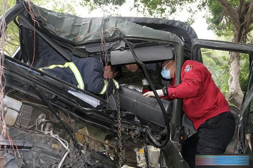 中國臺灣網2月17日消息 據臺灣媒體報道,金門縣今天上午7時50分許傳出一起軍車撞樹事故,1輛隸屬臺軍金門防御區的10噸重軍用大貨車行經太武山聯勤支部門口,疑因閃避小狗撞上樹齡約50年的大榕樹,軍車車頭在猛烈撞擊下幾乎全毀,龔姓士兵(21歲,高雄人)駕駛該車輛,左腿骨折受困車內約30分鐘。